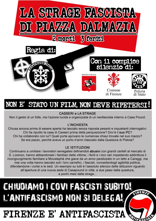 Riceviamo da Firenze Antifascista, l’assemblea fiorentina che comprende alcune realtà attive sul territorio nell’ambito dell’antifascismo, una notizia a dir poco agghiacciante, ma che nella città dove la retorica antidegrado e le campagne contro i venditori ambulanti assumono toni paragonabili alle peggiori sparate leghiste, creando un clima fertile per gente come Gianluca Casseri, militante di Casapound che sparò ed uccise Diop e Samb, ferendo altri tre ragazzi colpevoli d’avere la pelle nera, o i poliziotti autori di pestaggi ai danni di rifugiati somali.